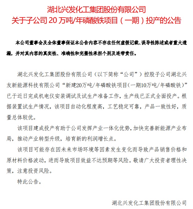 中國粉體網(wǎng)訊 9月4日,興發(fā)集團(tuán)發(fā)布公告,控股子公司湖北興友新能源科技有限公司“新建20萬噸/年磷酸鐵項目(一期10萬噸/年磷酸鐵)”已于近日完成機(jī)電儀安裝調(diào)試及試生產(chǎn)準(zhǔn)備工作,生產(chǎn)線已正式全面投產(chǎn)。根據(jù)裝置試生產(chǎn)情況,該項目自動化程度高,工藝穩(wěn)定可靠,產(chǎn)品一致性好,質(zhì)量總體較優(yōu)。