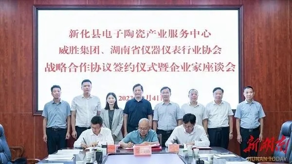 會上,鄒誼翔介紹了新化縣科技創新和先進陶瓷產業發展情況。湖南省美程陶瓷科技有限公司、新化縣電子陶瓷產業服務中心相關負責人作了發言。威勝集團有限公司、湖南省儀器儀表行業協會與新化縣電子陶瓷產業服務中心簽訂了戰略合作協議。