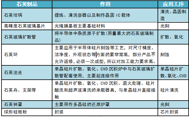 半導體集成電路工藝制程中,需要用到大量的石英制品,按照工作環境溫度的不同,分為高溫工藝和低溫工藝兩大類,高溫工藝包括擴散、氧化等,低溫工藝包括刻蝕、封裝、光刻、清洗等。