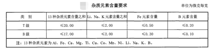 T級石英玻璃管的鋁、鐵、鈣、鎂、鈦、銅、鈷、錳、鎳、鋰、鈉、鉀、硼十三種雜質元素的總含量應不大于30.00x10-6,其中:鐵含量應不大于1.50x10-6,鈦含量應不大于3.00x10-6,銅含量應不大于0.80x10-6,硼含量應不大于0.20x10-6,鋰、鈉、鉀總含量應不大于5.00x10-6。
