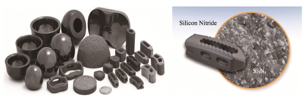 氮化硅陶瓷除具有較高的強度和韌性以外,其優(yōu)異的化學(xué)穩(wěn)定性和生物相容性使其非常適合作為生物陶瓷。氮化硅陶瓷材料較傳統(tǒng)的氧化鋯生物陶瓷具有更加優(yōu)異的抗感染力以及骨長上和骨長入能力。與此同時,氮化硅陶瓷材料不僅具有高硬度、高耐磨性的表面特性,還具有多孔性特征,該特性能夠支持同位格的骨骼內(nèi)部生長,有利于支撐骨架和耐久生物固定。適合于假體、膝關(guān)節(jié)和外科整形手術(shù)移植部件等生物領(lǐng)域的應(yīng)用。