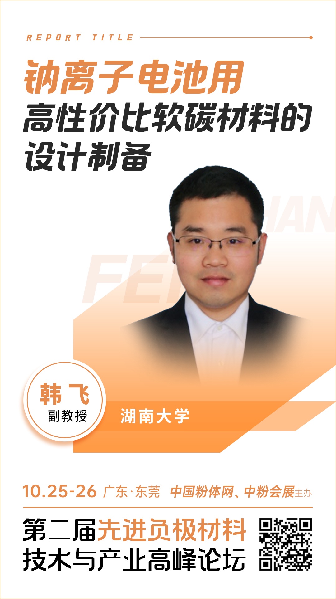 針對各類負極材料的產業化技術與國內外市場狀況,中國粉體網將于10月25-26日在東莞舉辦第二屆先進負極材料技術與產業高峰論壇。屆時,湖南大學副教授韓飛將作題為《鈉離子電池用高性價比軟碳材料的設計制備》的報告。報告圍繞當前鈉電用碳材料的技術研發和產業化布局而展開,分析總結軟碳材料在鈉電領域的優劣勢以及應用現狀,將重點介紹瀝青基軟碳材料、瀝青軟碳/高分子硬碳復合材料、煤基軟碳材料的結構設計、性質調控以及電化學性能,加快軟碳材料的產業化推進,促進鈉電池的健康發展。