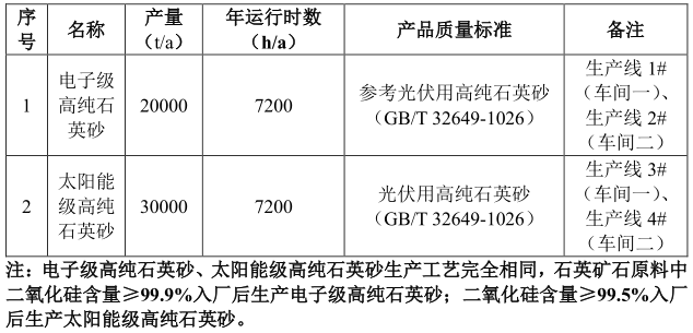 電子級高純石英砂使用的質(zhì)量較高石英原礦作為原料,二氧化硅含量≥99.9%;太陽能級高純石英砂使用的次一級的石英原礦石作為原料,二氧化硅含量約99.5%左右。電子級高純石英砂設(shè)置兩條生產(chǎn)線、太陽能級高純石英砂設(shè)置兩條生產(chǎn)線,其他生產(chǎn)工藝完全相同。
