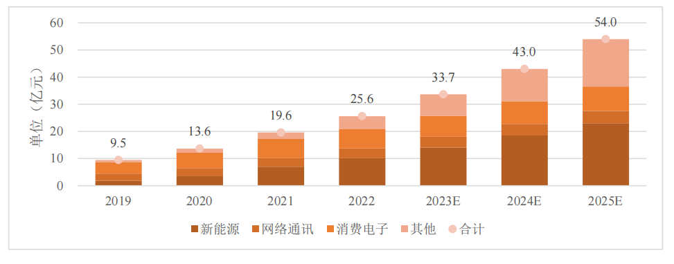 根據(jù)高工產(chǎn)業(yè)研究院數(shù)據(jù),2022年全球?qū)岱垠w材料市場規(guī)模為50.4億元,其中球形氧化鋁導(dǎo)熱粉體市場規(guī)模占比50.8%,為25.6億元,同比增長30.7%。據(jù)壹石通公告,單輛新能源汽車大約需要使用不低于10kg的球形氧化鋁,而且新能源汽車市場仍在快速增長,再加上氧化鋁價格下降使得其在5G、消費電子領(lǐng)域?qū)岱垠w材料中滲透率增加。據(jù)預(yù)測2022-2025年全球球形氧化鋁導(dǎo)熱材料市場規(guī)模年復(fù)合增速將達28.2%,到2025年將達54.0億元。