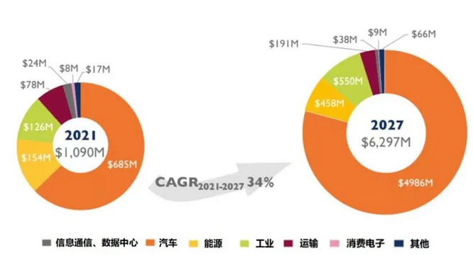 2021年-2027年(預測)碳化硅功率器件各細分領域市場占比