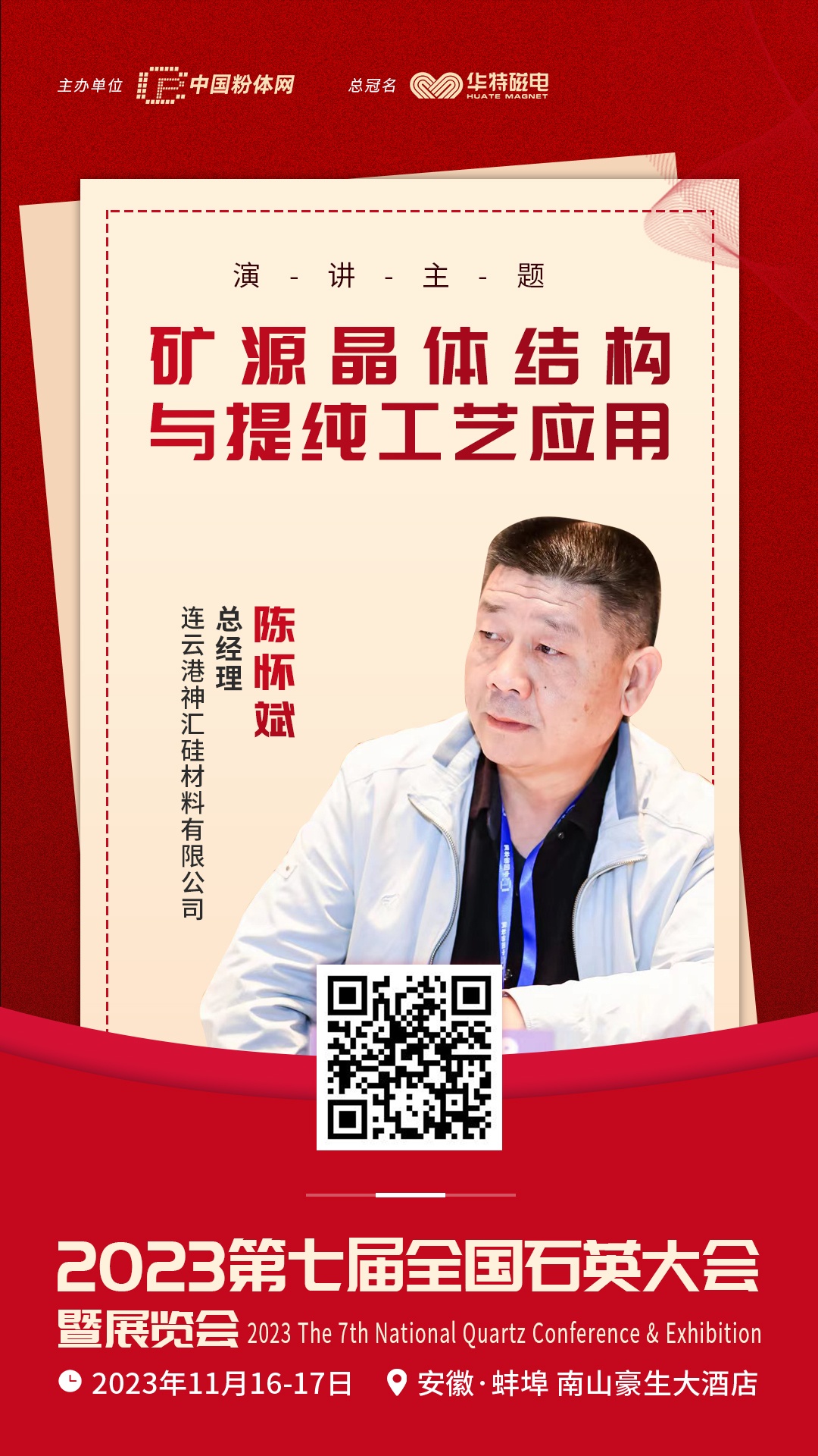 2023年11月16~17日,由中國粉體網(wǎng)主辦的“2023(第七屆)全國石英大會暨展覽會”將于安徽蚌埠召開,屆時連云港神匯硅材料有限公司總經(jīng)理陳懷斌將做《礦源晶體結(jié)構(gòu)與提純工藝應(yīng)用》的報告。歡迎感興趣的朋友親臨現(xiàn)場,聆聽專家的精彩報告!
