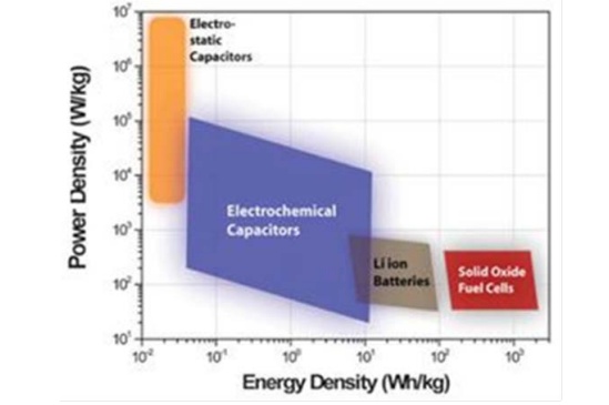 中國粉體網(wǎng)訊 目前主流的電能存儲(chǔ)器件主要有四種,分別是:化學(xué)儲(chǔ)能裝置(電池)、固體氧化物燃料電池(SOFCs)、電化學(xué)電容器(ECs)和靜電電容器(電介質(zhì)電容器)。圖中可以看出,四種電能存儲(chǔ)器件均不能具備高的儲(chǔ)能密度的同時(shí)兼顧高的功率密度。