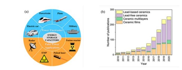 (a)儲(chǔ)能陶瓷的應(yīng)用, (b)2010-2020 年電介質(zhì)儲(chǔ)能材料論文發(fā)表情況