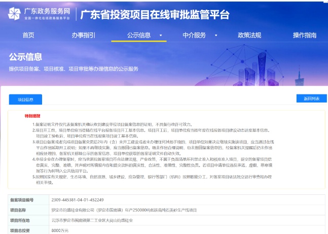 9月27日,在廣東省投資項目在線審批監管平臺上,羅定市鈞盛硅業有限公司(羅定市圍底鎮)年產25萬噸低鐵高純石英砂生產線項目備案通過。建設內容包括選礦、生產及提純石英砂、尾礦以及其他配套附屬設施,辦公區等。建筑面積約25000平方米,設備共計約35臺。