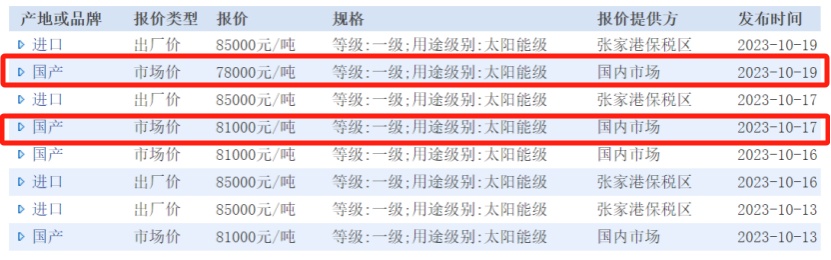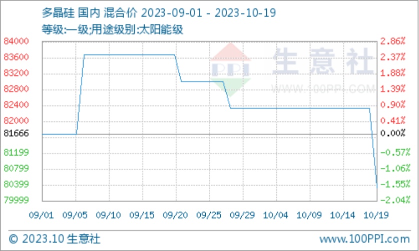 中國粉體網訊 10月19日,生意社公布最新多晶硅報價,最新價格顯示,硅料價格78000元/噸,相較10月17日81000降價3000元/噸,來到8000元以下。