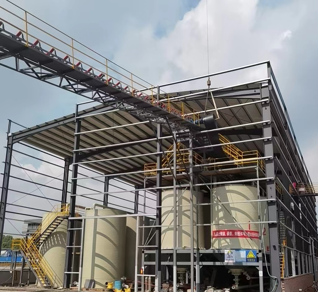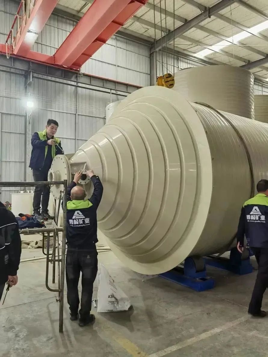 采用pph材質,在pph中加入進口保溫材料,可起到保溫作用,且有防紫外線功能;耐熱溫度可高達90-120℃,不易變形;酸洗反應罐一般直徑在3.5米,高度為5.5米,錐形,以便于出料,體積為50m3每個罐體,裝砂量為50噸左右,密封多開孔形,上面為橢圓形可在酸洗反應罐上下開設進酸、抽酸、進氣等多個通道管路和閥門。酸洗反應罐內襯脫酸系統、砂、酸過濾系統,集酸洗與脫酸為一體,做到一罐多用。