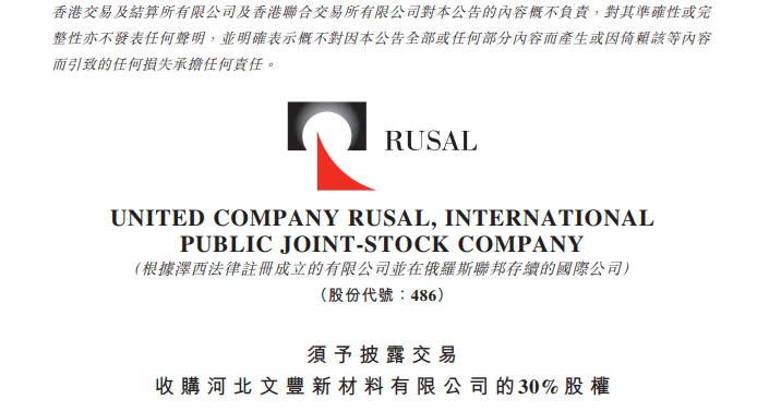 中國粉體網訊 10月24日,俄鋁在港交所公告,該公司10月23日與河北文豐實業集團有限公司(下稱“文豐集團”)訂立協議,后者同意出售河北文豐新材料全部股權的30%,代價為人民幣19.11億元。