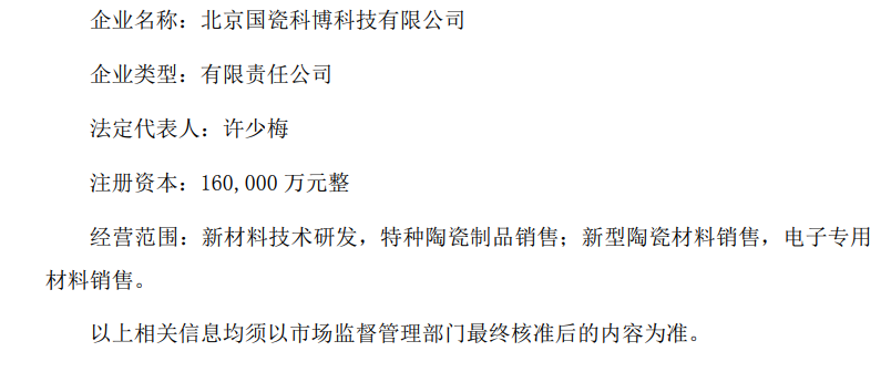 中國粉體網訊 近日,國瓷材料發布公告,國瓷材料擬使用自有或自籌資金160,000萬元人民幣在北京市投資設立全資子公司北京國瓷科博科技有限公司。