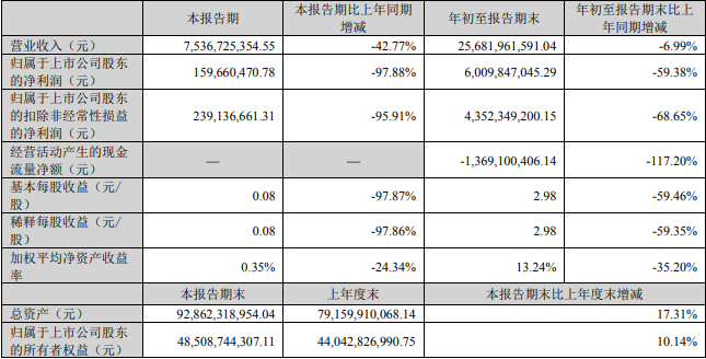 中國粉體網訊 10月30晚間,鋰電巨頭贛鋒鋰業公布三季度報告。報告顯示,前三季度該公司營收為256.8億元,同比下降6.99%;歸母凈利潤60.1億元,同比下降59.38%,扣非凈利潤43.52億元,同比下降68.65%。其中,第三季度贛鋒鋰業業績下挫明顯,單季營收為75.37億元,同比下降42.77%。僅實現歸母凈利潤1.6億元,同比下滑97.88%。