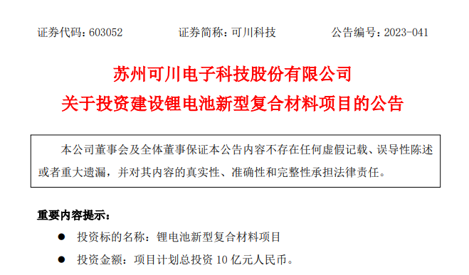 10億元!可川科技擬在江蘇淮安投建鋰電池新型復合材料項目