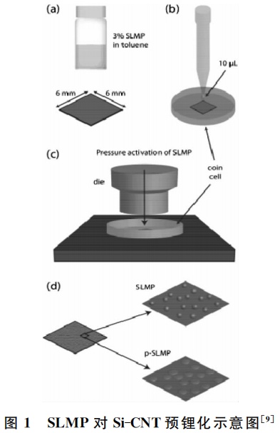 Sun等研究了用穩定的金屬鋰粉對硬碳電極進行預鋰化,以彌補第一次鋰嵌入過程中的鋰損耗。結果表明:當鋰粉表面壓力達到6Mpa時,穩定金屬鋰粉表面的 Li2CO3保護層被擠壓破碎,能夠使金屬鋰與硬碳充分接觸。且當鋰粉摻量為3g/m2時,鋰粉的利用效率為56%,首次放電效率提高18%。鋰粉預鋰化對硬碳電極的初始容量幾乎沒有影響,且循環性能略有提高。Forney采用SLMP對硅碳納米管(Si-CNT)預鋰化,將含有SLMP的甲苯溶液滴在Si-CNT負極材料表面,待溶劑揮發后壓片、激活,如圖1所示。結果表明:采用預鋰化后首次不可逆容量損失減少20%~40%,說明SLMP的壓片激活對預鋰化效果影響顯著。但鋰的密度很低,對于通過在陽極表面上滴落SLMP分散液將SLMP均勻分散的方式,很難控制其均勻性。