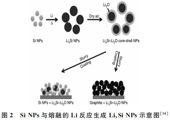 Zhao等報道了一種干燥空氣中穩定的LixSi@Li2O預鋰化試劑,如圖2所示。在注入電解液時,可直接激活LixSi@Li2O對硅、石墨負極進行預鋰化。然而LixSi@Li2O的預鋰化容量僅為1310mAh/g,而Li15Si4的理論比容量為3500mAh/g,這是由于Li2O鈍化層的形成消耗了活性鋰。LixSi@Li2O只能在乙醚、甲苯等低極性溶劑中保持穩定,這與目前基于PVDF或CMC-SBR的漿料加工是不兼容的。當LixSi@Li2O暴露在潮濕的空氣中(相對濕度約為10%)時,會出現快速的容量衰減。因此,它的化學穩定性仍需要進一步改善,以兼容當前的電池制造工藝。