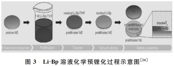 后來,報道了在1,2-二甲氧基乙烷(DME)或四氫呋喃(THF)溶劑中使用金屬鋰和萘(Li-Naph)進行負極化學預鋰化。Li-Naph比正丁基鋰具有更好的化學穩定性,因為它的孤對電子離域分布在共軛芳香環上。Li-Naph的氧化還原電位為0.35V,略低于Si的SEI形成電位,略高于Si的鋰化電位,這只適合于補償SEI形成的首次不可逆容量。Shen等人研究了Li-Naph用于硬碳電極的化學預鋰化,首次庫侖效率從75.5%提高到99.5%。同時,發現在預鋰化過程中形成了一個以有機成分為主的預制 SEI膜,然后在初始放電過程中進一步形成了一個以無機LiF為主的致密而結實的SEI膜。這種生成的SEI薄膜比在首次放電過程中直接形成的薄膜更薄、更密、更堅固。與Li-Naph類似,在二甲醚或四氫呋喃溶劑中的鋰聯苯(Li-Bp)也被報道用于化學預鋰化。Wang等人引入了具有環境-空氣穩定的鋰聯苯/四氫呋喃(Li-Bp/THF)溶液來預鋰化磷/碳復合負極,首次庫侖效率從74%提高到94%。化學預鋰化過程中剩余的Li-Bp可以作為保護層,防止高反應性電極暴露在空氣中;隨后,剩余的Li-Bp可以在碳酸鹽基電解質中轉化為氧化還原惰性Bp,如圖3所示。