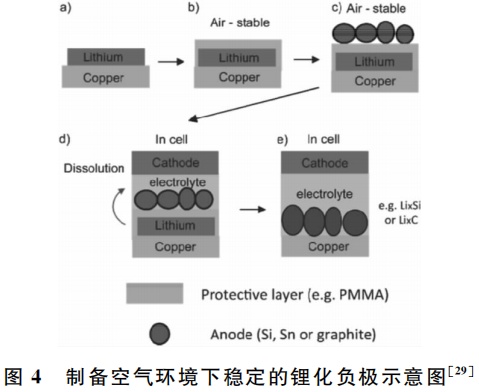 此外,在聚合物薄膜(石墨(或硅)/聚甲基丙烯酸甲酯(PMMA)/鋰三層結構)的保護下,金屬鋰預先沉積在集電極上。選擇的PMMA涂層可被碳酸鹽基電解質溶解在電池中,實現金屬鋰與預鋰化負極材料的接觸,如圖4所示。然而,一些潛在的問題需要考慮,如鋰粒子之間的有效接觸以及與柱面和棱柱形電池的漿料涂層工藝的兼容性等。仍需進一步測試,以評價這一方法在實際應用中的有效性。