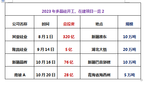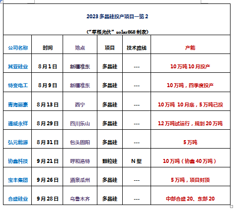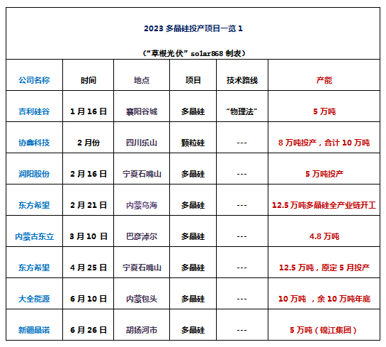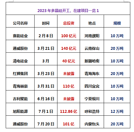 項目有吉利硅谷襄陽谷城5萬噸,協鑫科技四川樂山8萬噸顆粒硅、潤陽股份寧夏石嘴山5萬噸、東立光伏巴彥淖爾4.8萬噸、東方希望寧夏石嘴山12.5萬噸、大全能源內蒙古一期10萬噸、新疆晶諾5萬噸、其亞硅業新疆準東10萬噸、特變電工新疆準東10萬噸 、青海麗豪西寧10萬噸、通威永祥四川樂山12萬噸、弘元能源包頭固陽5萬噸、協鑫科技、TCL中環呼和浩特10萬噸顆粒硅。