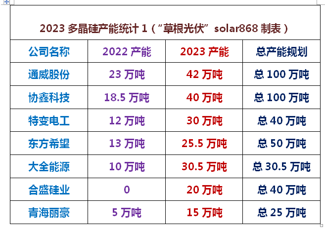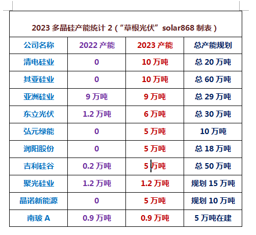 在多晶硅價格由瘋狂回歸理性的過程當中,產能加速放大成為重要推手。據“草根光伏”整理自硅料廠商投產信息,2023年1月迄今,我國多晶硅領域投產的項目達到16個左右,確定投產產能達到107.3萬噸。