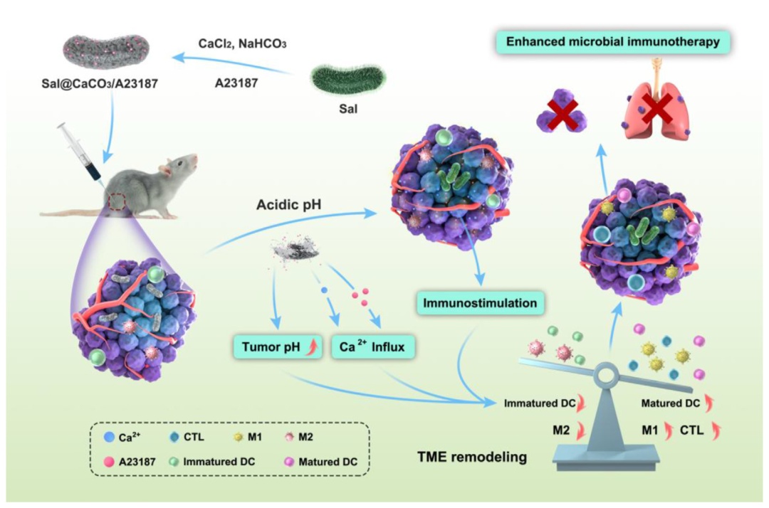在此,該研究構建了新的策略:一種基于細菌的新型自體癌癥疫苗,它采用碳酸鈣(CaCO3)生物礦化沙門氏菌(Sal)作為原位癌癥疫苗生產者和系統性ITM調節劑。