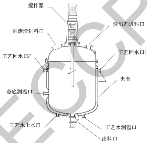 典型浸漬反應釜/器見圖B.1。固廢和浸取劑通過浸漬反應釜/器上部的進料口加入;浸漬反應釜冷卻水通過反應釜/器夾套下部的工藝水上水口進入,通過上部的工藝水回水口排出;浸漬反應釜/器中漿液溫度通過釜/器側壁下部的測溫口測量;夾套中工藝水溫度通過夾套下部的工藝水測溫口測量;浸漬反應釜/器中漿料通過攪拌器攪拌均勻;反應完畢后通過底部的出料口排出。