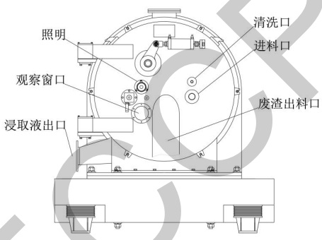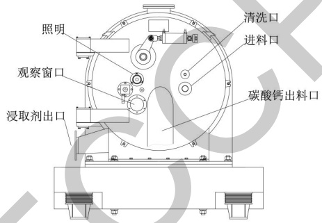 典型浸取液分離器見圖C.1。從浸漬反應釜/器排出的漿液通過進料口進入浸取液分離器,通過分離器內部的布料裝置均勻分布在轉鼓上;在轉鼓旋轉離心力作用下,含鈣浸取液透過轉鼓上的濾布甩出并通過浸取液出口排出;漿液中的廢渣通過濾布截留;分離完成后通過從清洗口進入的清洗水進行噴淋洗滌,洗滌水通過浸取液出口與浸取液交替排出;經過清洗的廢渣通過分離器內部的刮刀刮削卸料,后經廢渣出料口排出;浸取液分離器設有照明裝置,以便通過觀察口觀察分離狀態。