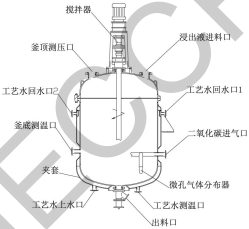 典型礦化反應釜/器見圖D.1。浸出液通過礦化反應釜/器上部的進料口加入;礦化反應釜冷卻水通過反應釜/器夾套下部的工藝水上水口進入,通過上部的工藝水回水口排出;礦化反應釜/器中漿液溫度通過釜/器側壁下部的測溫口測量;夾套中工藝水溫度通過夾套下部的工藝水測溫口測量;含二氧化碳器通過側壁的二氧化碳進氣口進入,進一步通過與之相連的微孔氣體分布器與浸出液接觸,進行礦化反應。礦化反應釜/器中漿料通過攪拌器攪拌均勻;反應完畢后通過底部的出料口排出。