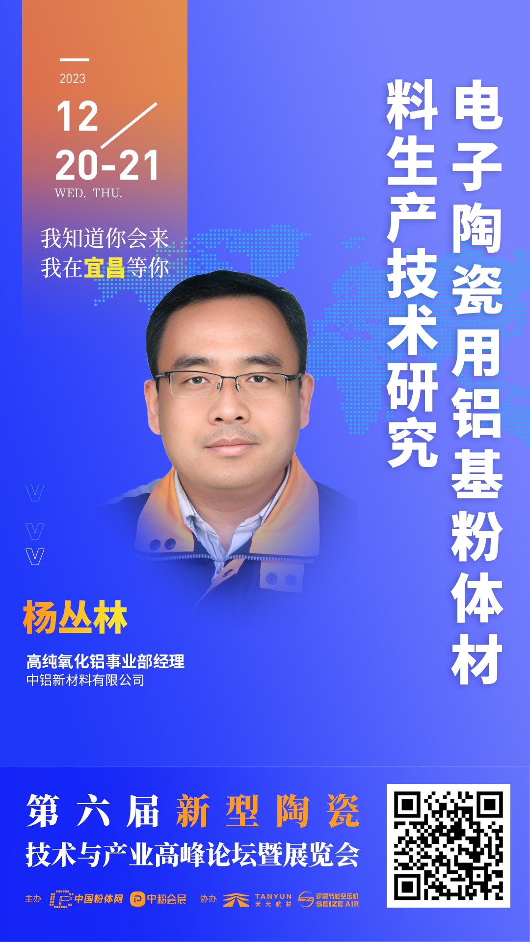 想知道,高純的鋁基陶瓷材料在如何更好的利用于電子陶瓷中?中國粉體網將于2023年12月20-21日在湖北宜昌舉辦“第六屆新型陶瓷技術與產業高峰論壇”,屆時,中鋁新材料有限公司高純氧化鋁事業部經理楊叢林將帶來題為《電子陶瓷用鋁基粉體材料生產技術研究》的報告。將對電子陶瓷用高純氧化鋁和高純氮化鋁兩系列產品生產技術進行詳細介紹。