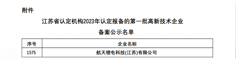 在本月初(2023年11月6日),航天鋰電還成功入選江蘇省“高新技術企業”,標志著航天鋰電在研發和創新方面得到相關部門的肯定和認可。
