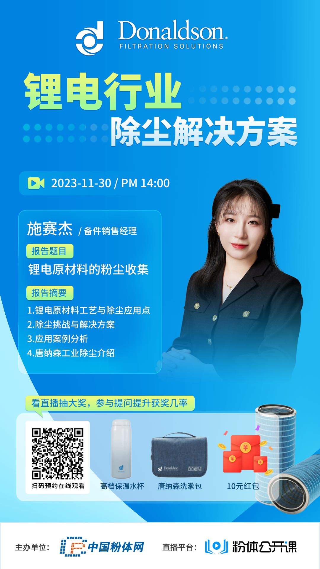粉體公開課聯合唐納森共同舉辦此次會議,探討鋰電原材料的粉塵收集!歡迎大家掃碼預約觀看!