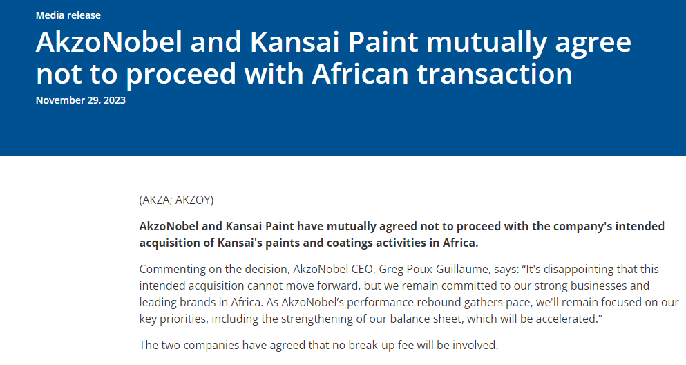 中國粉體網訊 11月29日,全球涂料巨頭阿克蘇諾貝爾官宣,已經和關西涂料公司達成一致,不再繼續進行該公司在非洲收購關西油漆和涂料業務的計劃。
