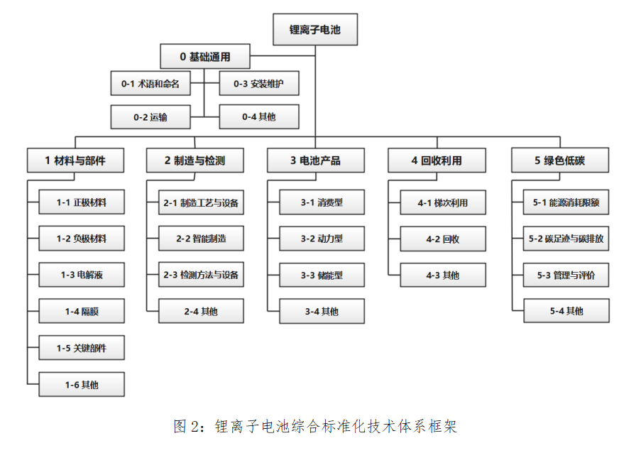 鋰離子電池綜合標準化技術(shù)體系主要包括基礎(chǔ)通用、材料與部件、制造與檢測、電池產(chǎn)品、回收利用、綠色低碳6大類、25個小類。