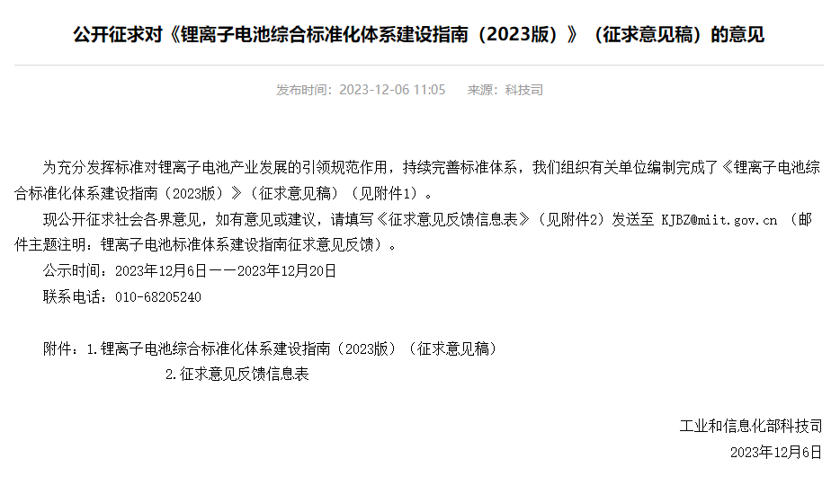 12月6日,工信部發(fā)布了《鋰離子電池綜合標準化體系建設(shè)指南(2023版)(征求意見稿)》,意見稿指出,在產(chǎn)業(yè)界共同努力下,我國已發(fā)展成為全球最大的鋰離子電池生產(chǎn)國,建成了從上游關(guān)鍵材料到電芯制造、電池組裝、設(shè)備制造的完備體系。2023年上半年,我國鋰離子電池產(chǎn)業(yè)延續(xù)增長態(tài)勢,全國鋰電池產(chǎn)量超過400GWh,同比增長超過43%,上半年鋰電池全行業(yè)營收達到6000億元。