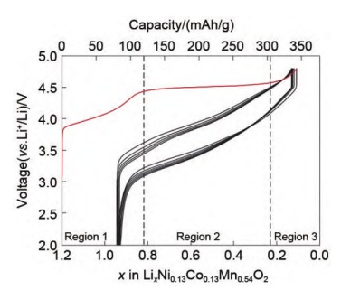 這是因為如果將LiMO2(M=鎳鈷錳)的首次充電曲線分為三個階段,除了在小于4.5 V時,Li+從活化的LiMeO2(Me為過渡金屬元素)中脫出,伴隨著Ni2+/Ni3+/Ni4+和Co3+/Co4+的氧化反應貢獻容量,實際容量(約120 mAh/g)和源于過渡金屬離子氧化的理論容量(約122 mAh/g)基本一致。