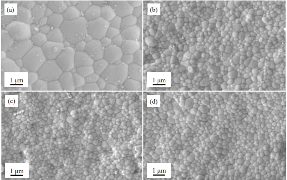 SDC陶瓷材料SEM圖片:(a)常規(guī)燒結(jié)(1450℃,3h);(b)閃燒(80V·cm-1);(c) 閃燒(100V·cm-1);(d)閃燒(120V·cm-1)