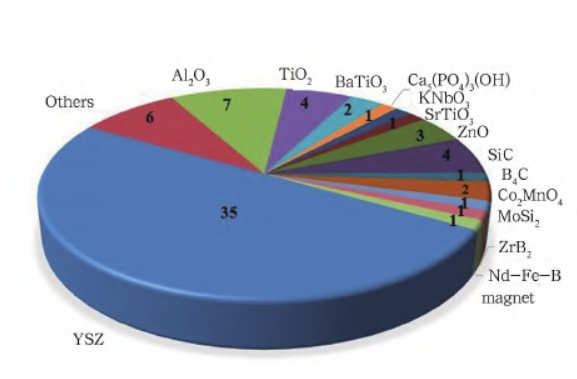 按陶瓷材料的類型所發(fā)表論文數(shù)量的餅圖