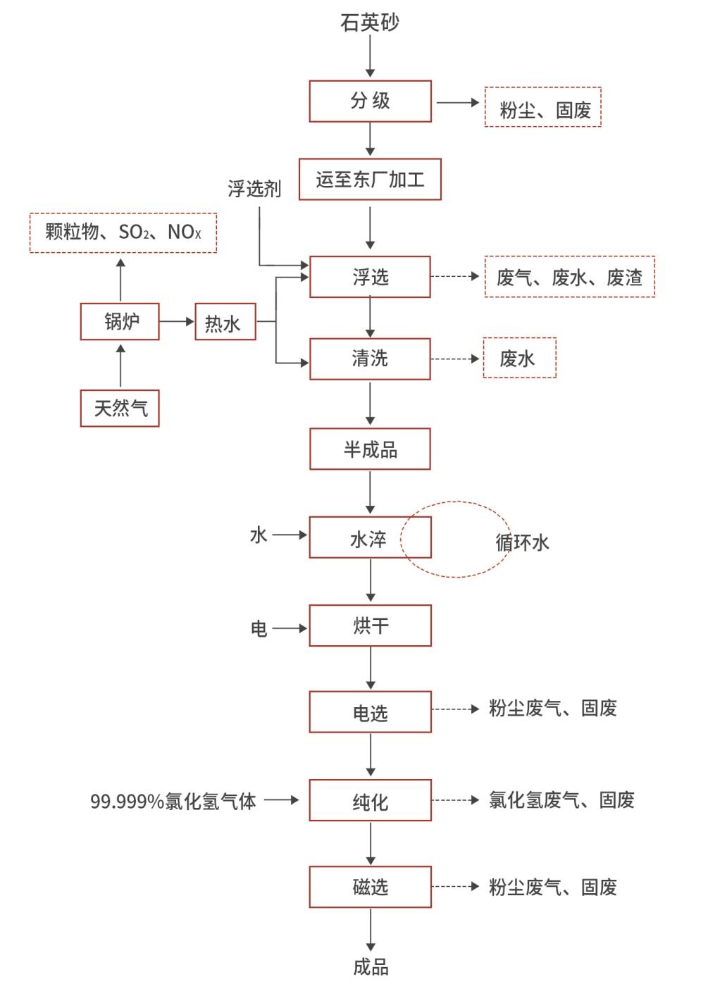 截至目前,陳總表示公司高純石英砂日產已達30-40噸。同時一些項目也在陸續投建中。如2023年4月,連云港神匯硅材料科技有限公司年產2萬噸高純石英砂項目環評公示。該項目總投資50000萬元,建設地點為東海縣洪莊鎮鎮區工業集中區。主要建設內容為:項目占地約37156平方米,廠房約11850平方米、附屬設施2463平方米,購置高溫烤砂爐、烘干機、電選機、磁選機等設備。工藝流程:半成品石英砂-超高溫水淬-烘干-電選-純化-磁選-成品。