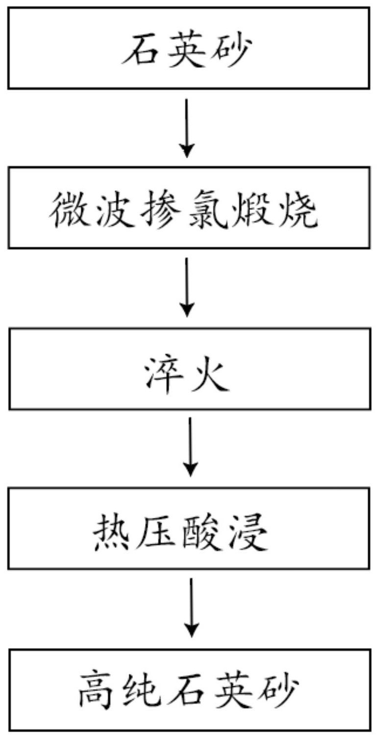 據悉,本發明公開了一種無氟無硝法制備高純石英砂的工藝,屬于高純石英砂制備技術領域,包括如下步驟:S1石英砂摻雜氯鹽進行微波煅燒,先以10‑20℃/min的升溫速率升溫至600℃后,再以5‑10℃/min的升溫速率升溫至900℃后保溫1‑3h;S2取出石英砂,淬火溶液淬火后用水沖洗;S3過濾干燥后的石英砂加入混酸溶液進行熱壓酸浸,攪拌條件下于80℃反應1.5‑2.5h后,以5‑10℃/min的速率升溫至200℃反應0.5‑1.5h,反應后固液分離對浸出渣進行超聲清洗干燥。