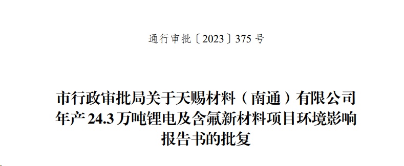 天賜材料年產(chǎn)24.3萬噸鋰電及含氟新材料項(xiàng)目環(huán)評(píng)獲批