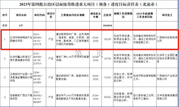 中國粉體網訊 近日,廣西壯族自治區重大項目建設推進領導小組辦公室印發了關于2023年第四批自治區層面統籌推進重大項目清單的通知,北流列入清單項目共4個,總投資26.49億元。