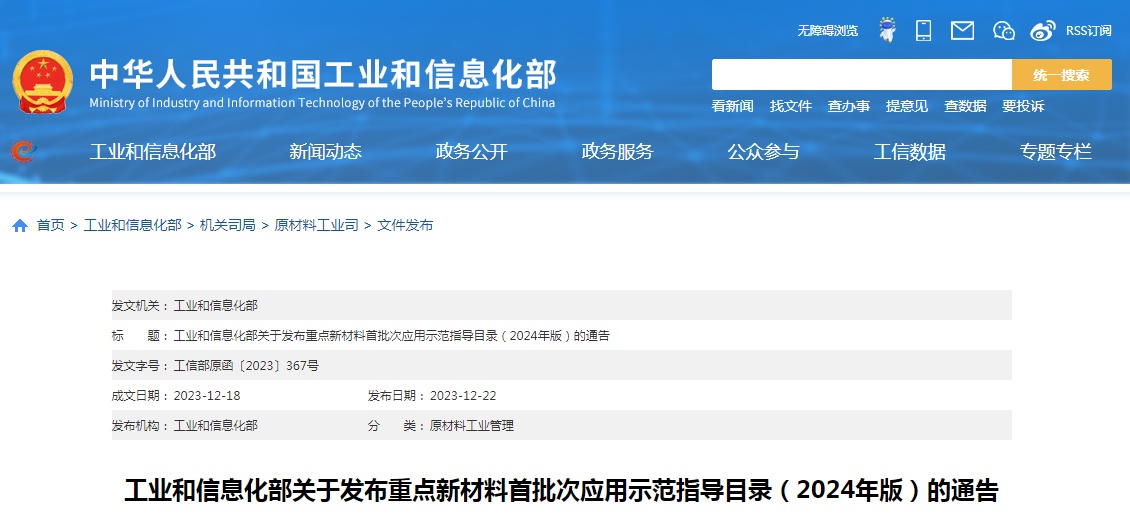 《重點新材料首批次應用示范指導目錄(2024年版)》自2024年1月1日起實施