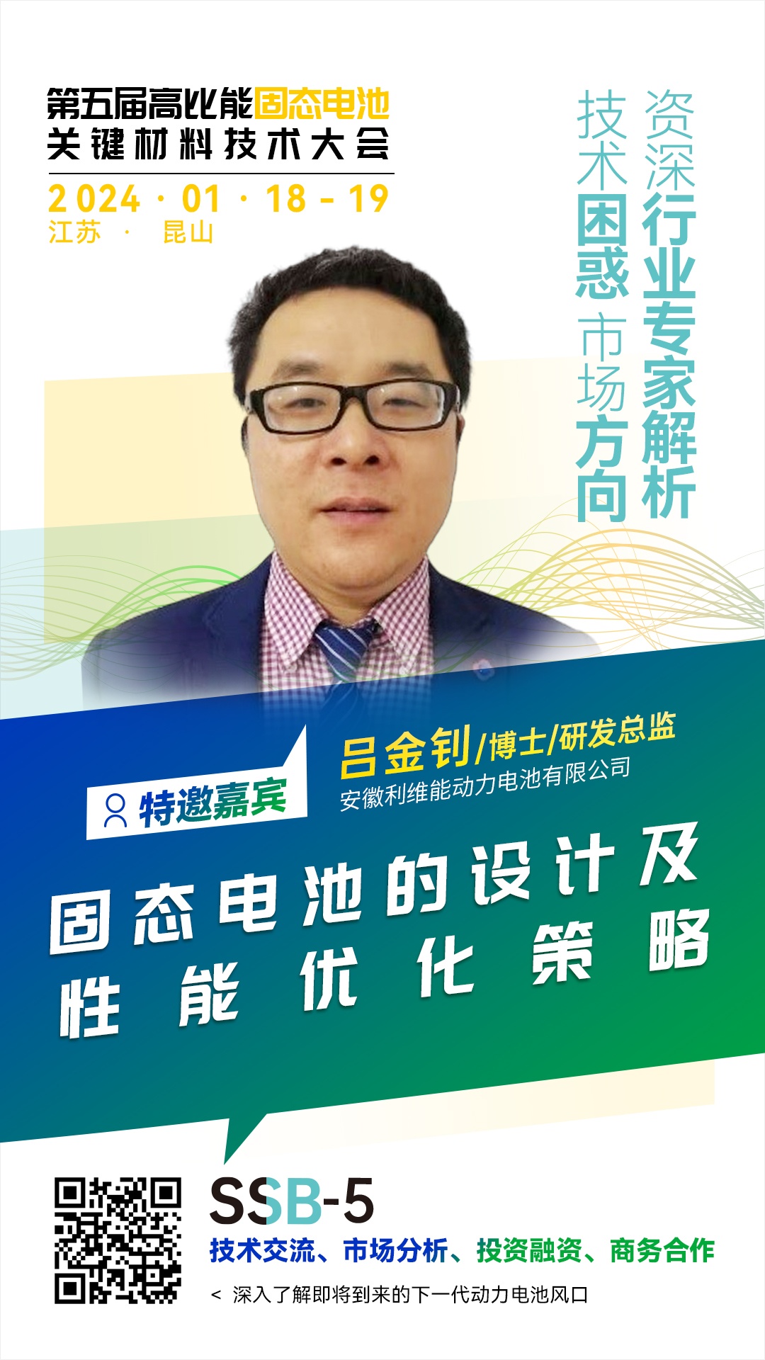 針對固態(tài)電池相關(guān)的技術(shù)、材料、市場及產(chǎn)業(yè)等方面的問題,中國粉體網(wǎng)將在昆山舉辦第五屆高比能固態(tài)電池關(guān)鍵材料技術(shù)大會。為致力于固態(tài)電池技術(shù)開發(fā)的企業(yè),科研院校,以及電動車、儲能、特種應(yīng)用等終端企業(yè)提供信息交流的平臺,開展產(chǎn)、學(xué)、研合作,共同推動行業(yè)發(fā)展。屆時,安徽利維能動力電池有限公司研發(fā)總監(jiān)呂金釗博士將作題為《固態(tài)電池的設(shè)計及其性能優(yōu)化策略》的報告。報告人將分享安徽利維能動力電池有限公司固態(tài)電池的開發(fā)進展,重點分析討論氧化物固態(tài)電解質(zhì)和凝膠電解質(zhì)引入固態(tài)電池的途徑、電芯設(shè)計、組裝方式等對固態(tài)電池性能的影響及其性能優(yōu)化策略。