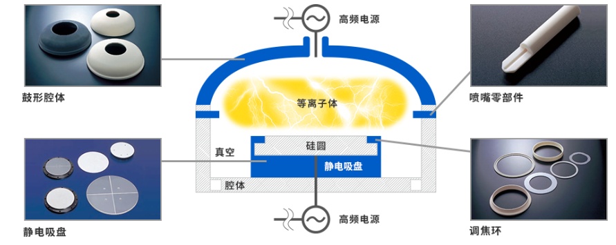半導體行業遵循“一代技術、一代工藝、一代設備”的產業規律,而半導體設備的升級迭代很大程度上依賴于精密零部件的技術突破。其中,精密陶瓷部件是最具有代表的半導體精密部件材料,其在化學氣相沉積、物理氣相沉積、離子注入、刻蝕等一系列半導體主要制造環節均有重要應用。如軸承、導軌、內襯、靜電吸盤、機械搬運臂等。尤其是在設備腔體內部 ,發揮支撐、保護、導流等功能。