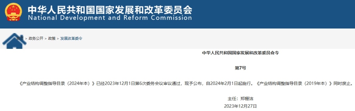 中國(guó)粉體網(wǎng)訊 據(jù)悉,《產(chǎn)業(yè)結(jié)構(gòu)調(diào)整指導(dǎo)目錄(2024年本)》已經(jīng)2023年12月1日第6次委務(wù)會(huì)議審議通過(guò),并正式公布,自2024年2月1日起施行。《產(chǎn)業(yè)結(jié)構(gòu)調(diào)整指導(dǎo)目錄(2019年本)》同時(shí)廢止。