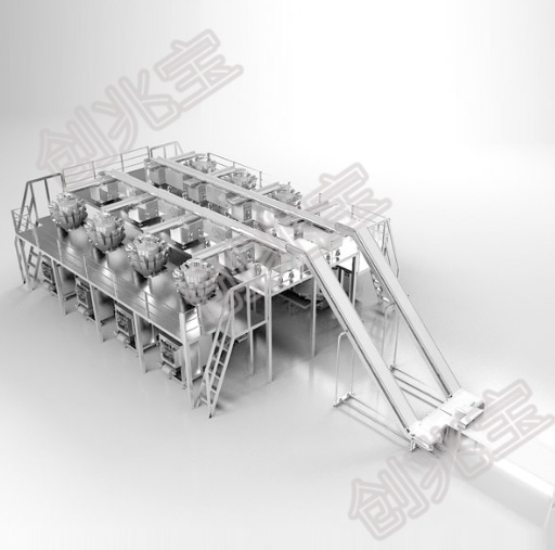 此集中供料方案適用于同類物料量大的包裝,整套結合緊湊,占地小。