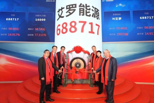 中國粉體網訊 1月3日,浙江艾羅網絡能源技術股份有限公司(證券簡稱:“艾羅能源”)在上海證券交易所正式上市交易。截至發稿,艾羅能源股價報99.80元/股,市值超150億元!