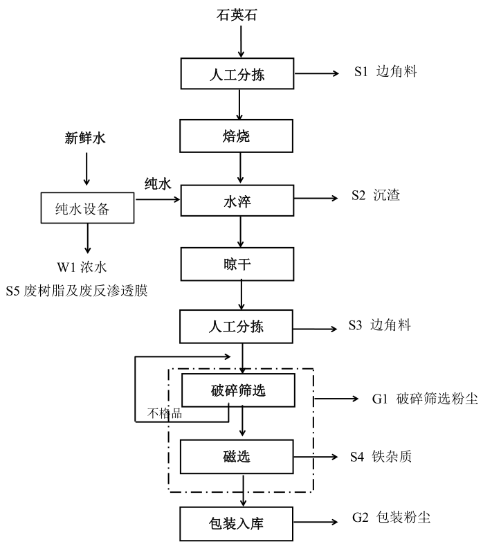 (6)破碎篩選:將分揀后的原料通過履帶輸送機運往破碎機進行進一步粉碎,項目破碎篩選和磁選為一體化設備,設備操作過程密閉。破碎機粉碎后的石英砂通過振動篩篩分下來。