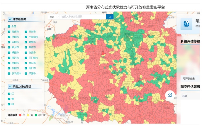 其中,河南明確分布式光伏開發(fā)紅、黃、綠區(qū)域,按季度向社會(huì)公布,并適時(shí)縮短測算公布周期;優(yōu)先支持綠色區(qū)域內(nèi)的分布式光伏項(xiàng)目,黃色、紅色區(qū)域內(nèi)的分布式光伏項(xiàng)目,待落實(shí)消納條件后,再行開發(fā)建設(shè)。根據(jù)河南省能源大數(shù)據(jù)中心公布的情況,河南不同區(qū)域的承載力情況如下圖所示,河南整體上已經(jīng)處于紅黃狀態(tài),綠色區(qū)域較小。